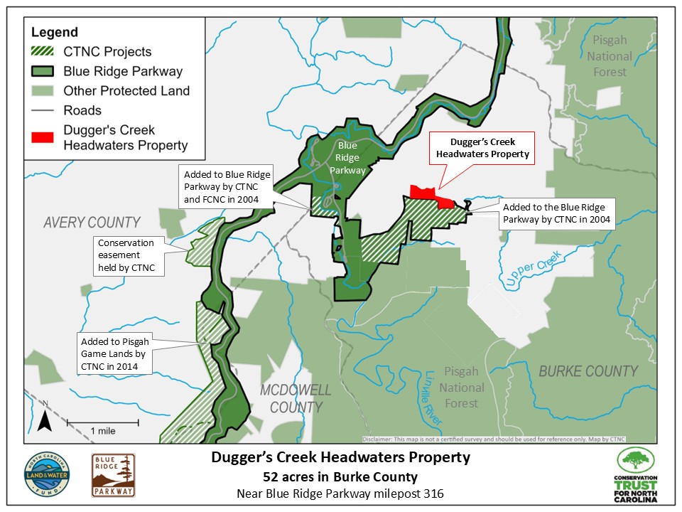 Conservation Trust for North Carolina (CTNC) recently purchased 52 acres at the head of the gorge in the headwaters of Dugger’s Creek, the last tributary entering the Linville River before tumbling over its massive falls. This is an important area for critical wildlife habitats, but it also protects water quality. Development or logging on this land could have had devastating long-term impacts on views from Linville Falls trails, and sent muddy water over Linville Falls and the smaller Dugger’s Creek Falls near Linville Falls Visitor Center.